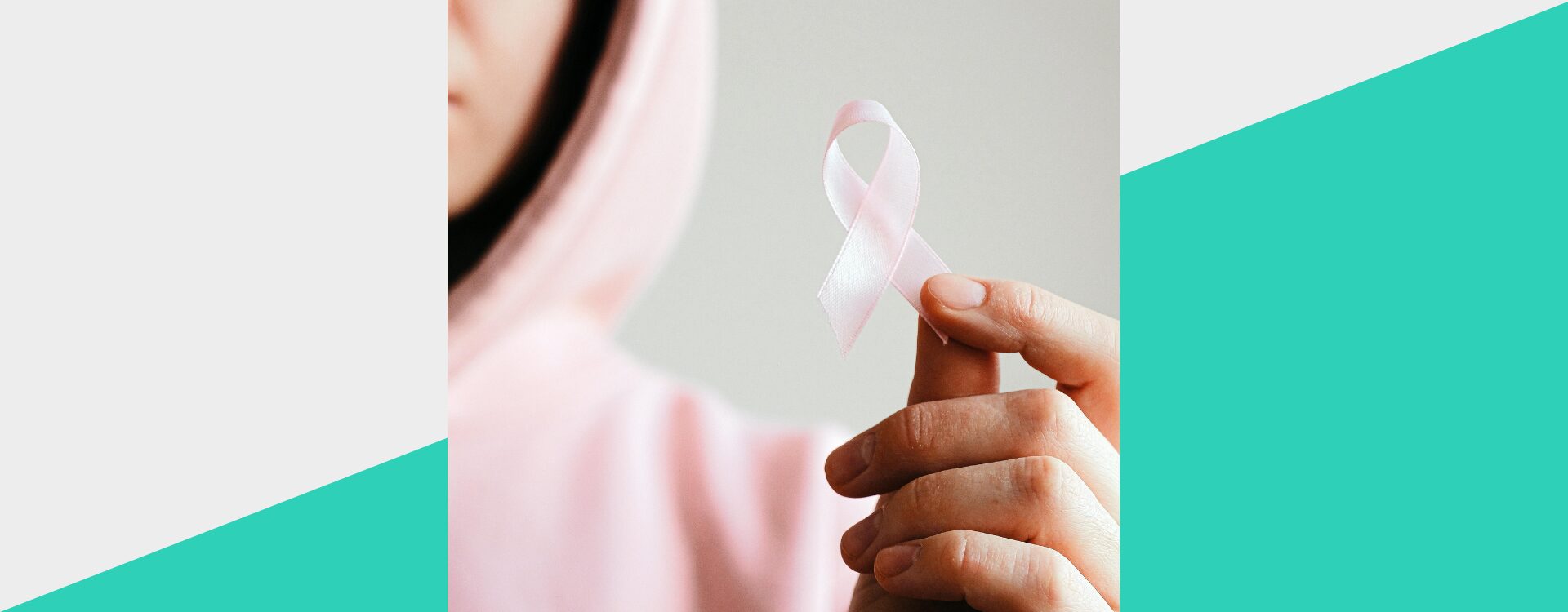 Person in rosa Hoodie hält eine rosa Schleife in der Hand welche für Krebs-Awareness steht