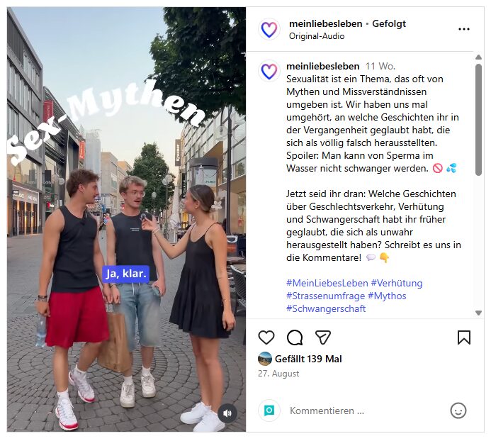 So setzen wir das auch bei unserem Kundenprojekt @meinliebesleben um. Auf dem Instagram-Kanal geht es um Aufklärung zu den Themen Körper, Sexualität und Liebe. Gerade bei sensiblen Themen ist Authentizität der Grundbaustein zum erfolgreichen Community-Aufbau, auch über die Gen Z hinaus. Neben klassischem UGC (User Generated Content) nutzen wir dafür beispielweise auch Formate wie Straßeninterviews gemeinsam mit unseren Content Creators: