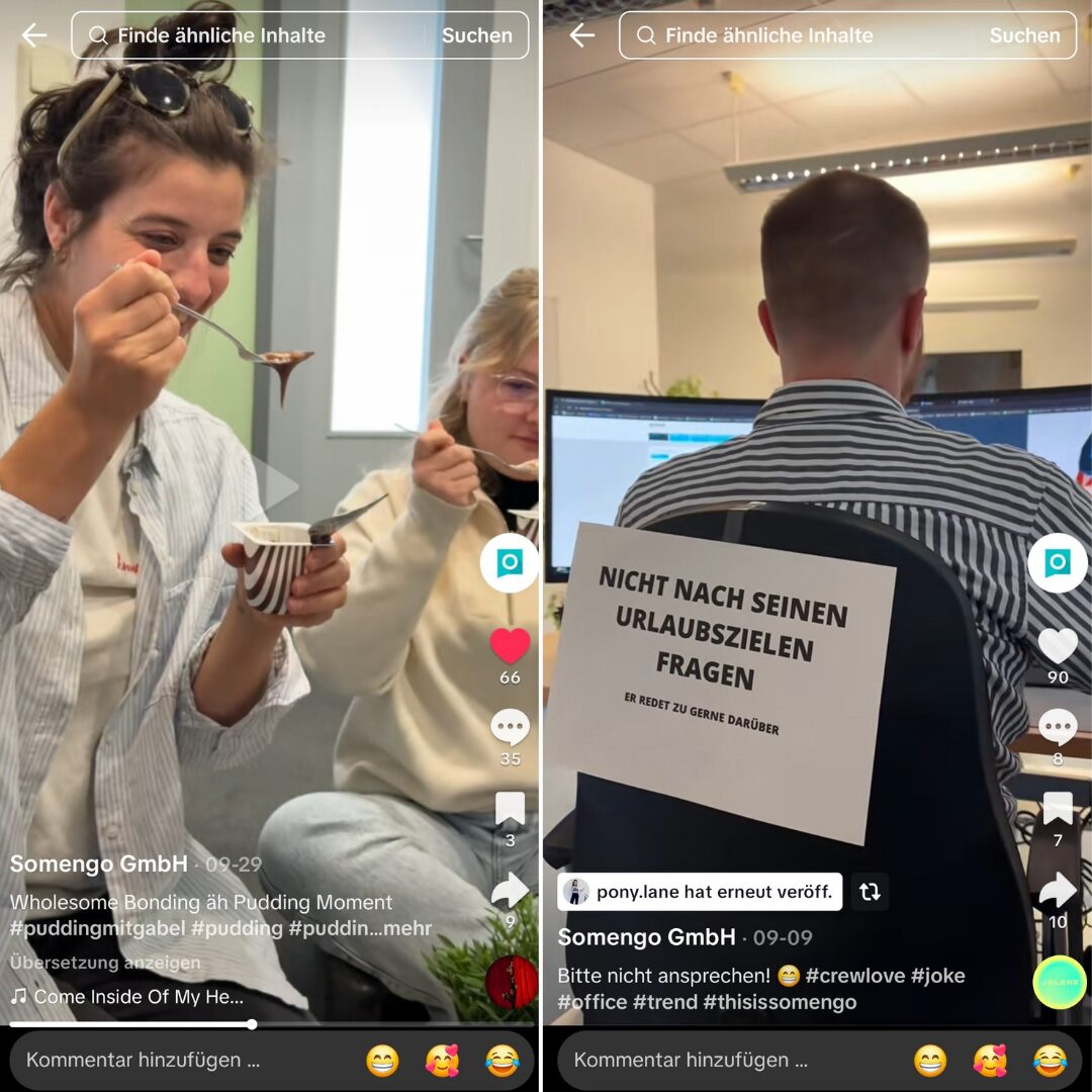 Wir bei Somengo unterscheiden in unserer Marketingstrategie ganz klar, wen wir auf welchem Kanal mit welchem Content erreichen wollen. Unser TikTok-Kanal ist hier klar unsere Employer Branding Spielwiese, wo wir Trends hinterherjagen und neue Formate ausprobieren. Oft entstehen die Content-Ideen beim gemeinsamen Mittagsessen oder wenn einer privat auf seinem Account etwas Lustiges gesehen hat und noch lustiger machen möchte. So brachte uns das Essen eines Puddings mit Gabeln knapp 2.400 organische Views oder der Trend „Frage XYZ nicht nach ABC, er/sie soll arbeiten“ über 1.400 Views sowie 90 Kommentare.
