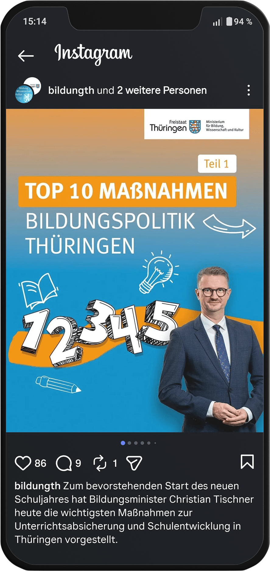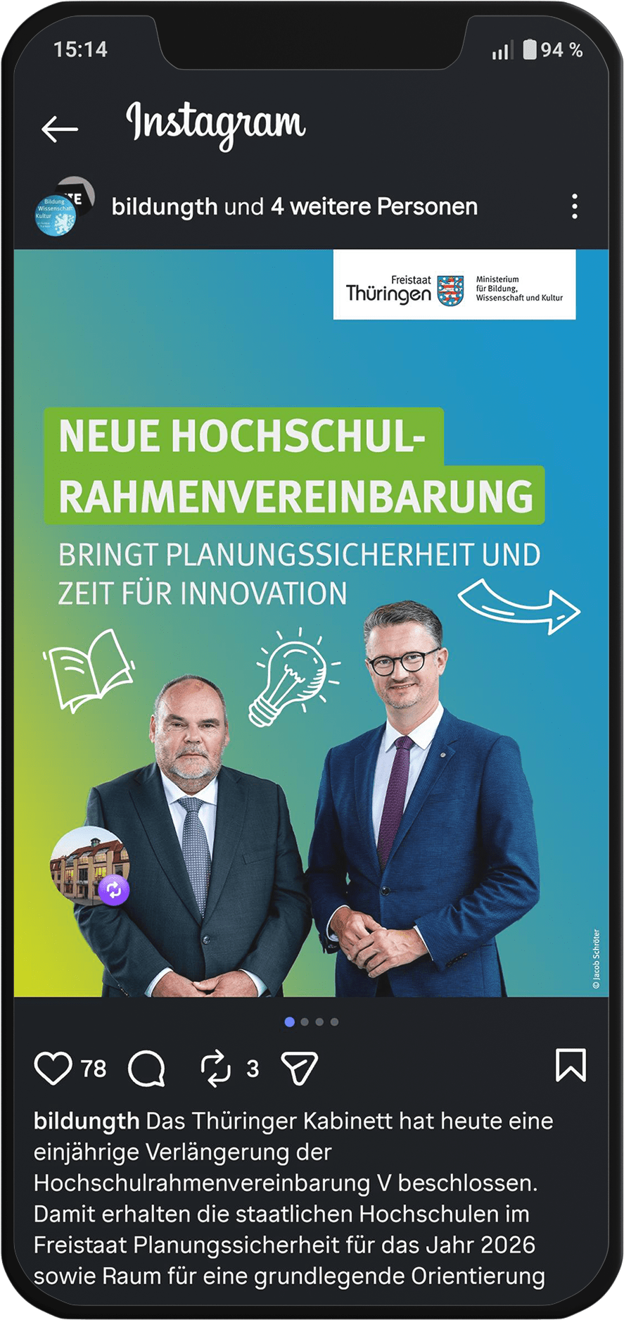 Mit Blick auf die vielschichtigen Zielgruppen und Adressaten sowie die breite Öffentlichkeitsarbeit spielt Social-Media für das Thüringer Ministerium für Bildung, Wissenschaft und Kultur (TMBWK) eine wesentliche Rolle in der täglichen Kommunikation. Als täglicher Sparringpartner besteht unsere Aufgabe darin, die strategische und operative Kommunikation des Ministeriums durch eine kreative, klare und zugleich vertrauensvolle sowie zielgruppenspezifische Ansprache messbar zu stärken. Dies umfasst sowohl die strategische Beratung im Rahmen der Öffentlichkeitsarbeit auf Social-Media als auch die Entwicklung und Umsetzung aufmerksamkeitsstarker Inhalte und Kampagnen – darunter Maßnahmen zur gezielten Gewinnung neuer Lehrkräfte im Rahmen der Lehrergewinnungskampagne „Erste Reihe Thüringen“.